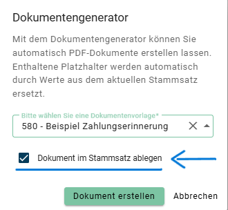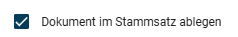 - Setzen Sie ein Häkchen bei „Dokument im Stammsatz ablegen“, wenn das Dokument im Stammsatz gespeichert werden soll.
