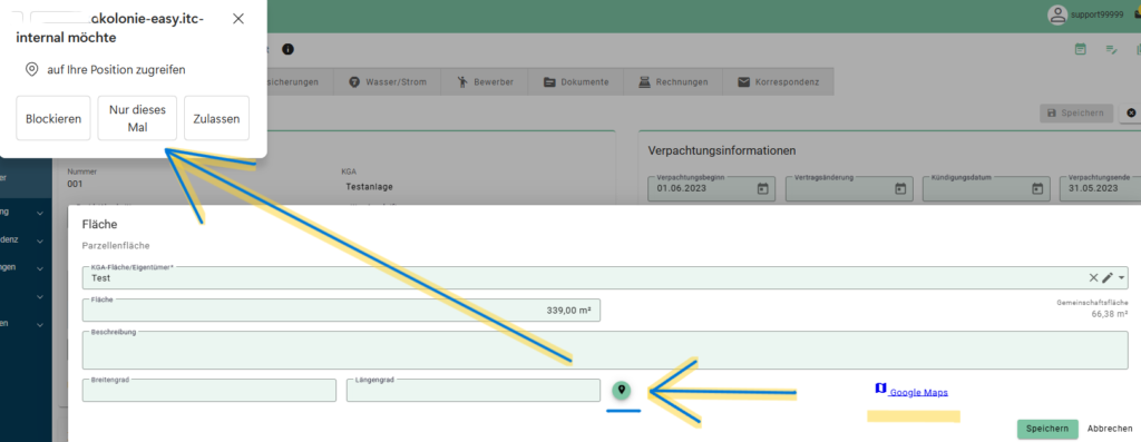 - Bestätigen Sie den Zugriff. Die Koordinaten werden automatisch übernommen und können gespeichert werden.
