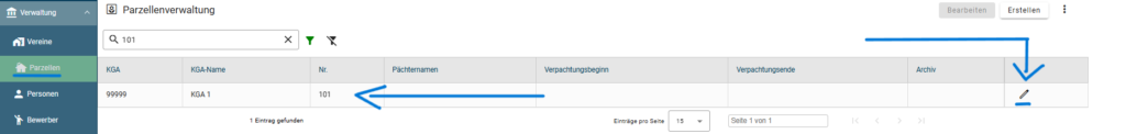 - Wählen Sie die gewünschte Parzelle aus, bei der der Pächterwechsel stattfinden soll. Entweder mit einem Doppelklick der linken Maustaste oder über das Stift-Symbol.