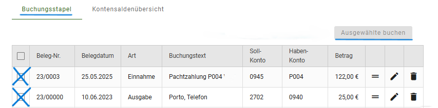 Wenn Sie geprüft haben, dass die Buchungen korrekt sind, klicken Sie im Buchungsstapel die entsprechenden Buchungen an und setzen den Haken.