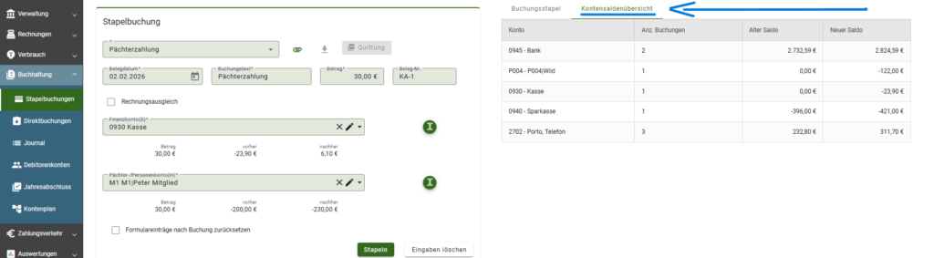 Konto: Wählen Sie die jeweilige Person oder den Pächter aus.