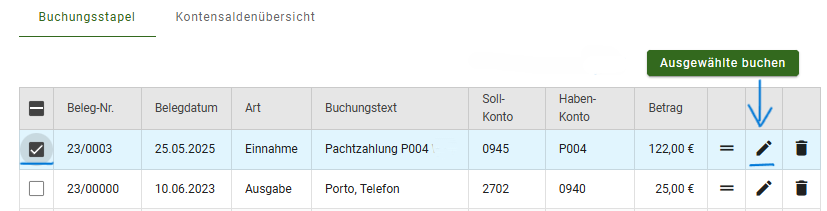 Wenn Sie eine Stapelbuchung bearbeiten möchten, klicken Sie auf das Stift-Symbol. Sie können die Buchung dann anpassen.