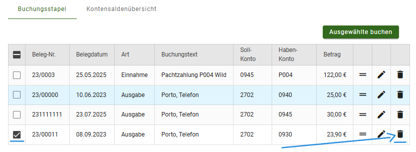 Wenn Sie eine Stapelbuchung löschen möchten, klicken Sie auf das Mülleimer-Symbol. Die Buchung wird aus dem Buchungsstapel entfern